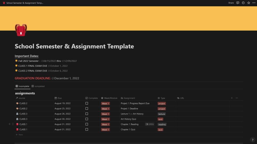Class Assignments & Due Dates Notion Template